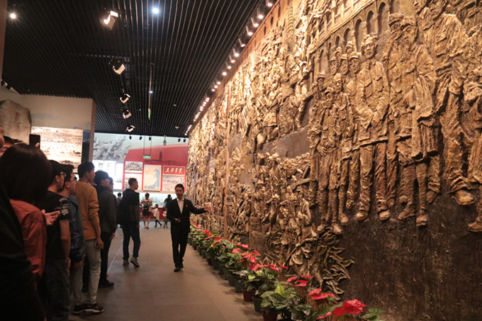 展馆共有两大展厅。第一部分“开天辟地”展厅从十九世纪中叶开启,讲解员向大家介绍了早期中国共产党人的事迹。1921年7月23日,中国共产党第一次全国代表大会由上海转移到嘉兴南湖一艘画舫上继续举行并闭幕,宣告了中国共产党的诞生。这艘画舫因而获得了一个永载中国革命史册的名字——红船,成为中国革命源头的象征。同学们跟随讲解员参观一幅幅油画、一件件纪念品,见证这段红色历史。随后,同学们来到了“光辉历程”展厅。在复兴之路的巨型浮雕前,一股肃穆之情在同学们心中油然而生。每一副面孔都代表着那些建设新中国的英雄先烈们,他们的名字也许鲜有人知,但他们所做的一切都为新时代铸下了坚固的基石。