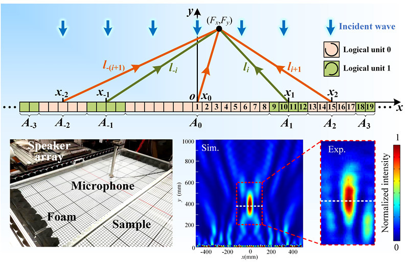声聚焦效应可以将声波能量聚集在某个局部空间并形成高能量区域,其作为一项重要的声学技术被广泛应用于工业超声无损检测、医学超声诊疗、侦查探测等领域,具有超强声波调控功能的声学超表面为实现声聚焦效应提供了一种可行性方法。但传统的声聚焦超表面普遍存在工作频带窄、焦点不可调节及结构复杂等问题,极大地限制了声聚焦超表面的实际应用,近些年来数字编码超表面的出现一定程度上解决了上述传统声聚焦超表面所存在的问题。