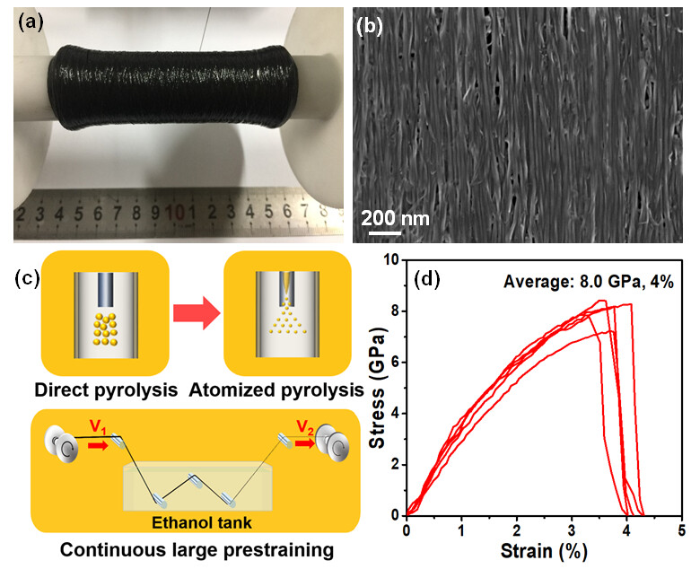 针对上述问题,王健农教授课题组创新地采用雾化催化热解法制备碳纳米管纤维。该方法有效改善了催化剂的催化效率,使制备的碳纳米管纤维具有较高的纯度。在此基础上,对碳纳米管纤维进行连续的预拉伸和辊压处理,极大地提高了碳纳米管纤维的取向性和致密性,所制备的碳纳米管纤维具有高强度(8.0GPa)、高杨氏模量(350GPa)和高延伸率(4%)的优异性能。该抗拉强度领先于所有人造宏观纤维的强度值,这将为高性能碳纳米管宏观材料的开发提供一种新的策略。