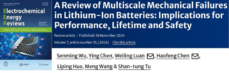 近日,应电化学能源领域权威期刊《电化学能源评论》(Electrochemical Energy Reviews,影响因子28.5)的邀请,开云官方网页版官网、先进电池系统与安全重点实验室栾伟玲教授课题组,与国家级高层次领军人才、讲席教授陈浩峰合作,发表了题为“锂离子电池多尺度机械失效及其对性能寿命和安全性的影响”的研究综述。该研究系统性地总结了锂离子电池在不同尺度上的机械失效行为及其对性能、寿命和安全性的影响,为理解和应对电池机械失效机制提供了创新思路和全新视角。
