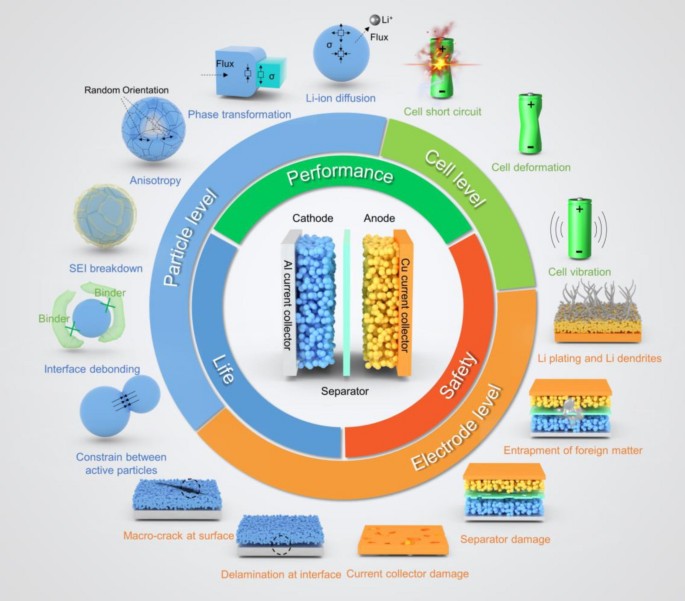 在锂电池研究领域,机械失效的复杂性来源于多物理场耦合和跨尺度效应。研究团队首次构建了一个统一的分析框架,全面覆盖粒子级(如锂离子扩散引起的应力集中与相变)、电极级(如涂层开裂与剥离)以及电池整体级(如机械应力诱发的内部短路与热失控)的失效机制,揭示了各失效模式之间的交互与演化规律。通过整合材料科学、力学与电化学领域的最新研究成果,团队提出了基于多物理场的机械失效建模方法,特别是在电化学-力耦合作用下,对活性颗粒在锂离子嵌入和析出过程中的应力分布及材料损伤进行了深入分析。